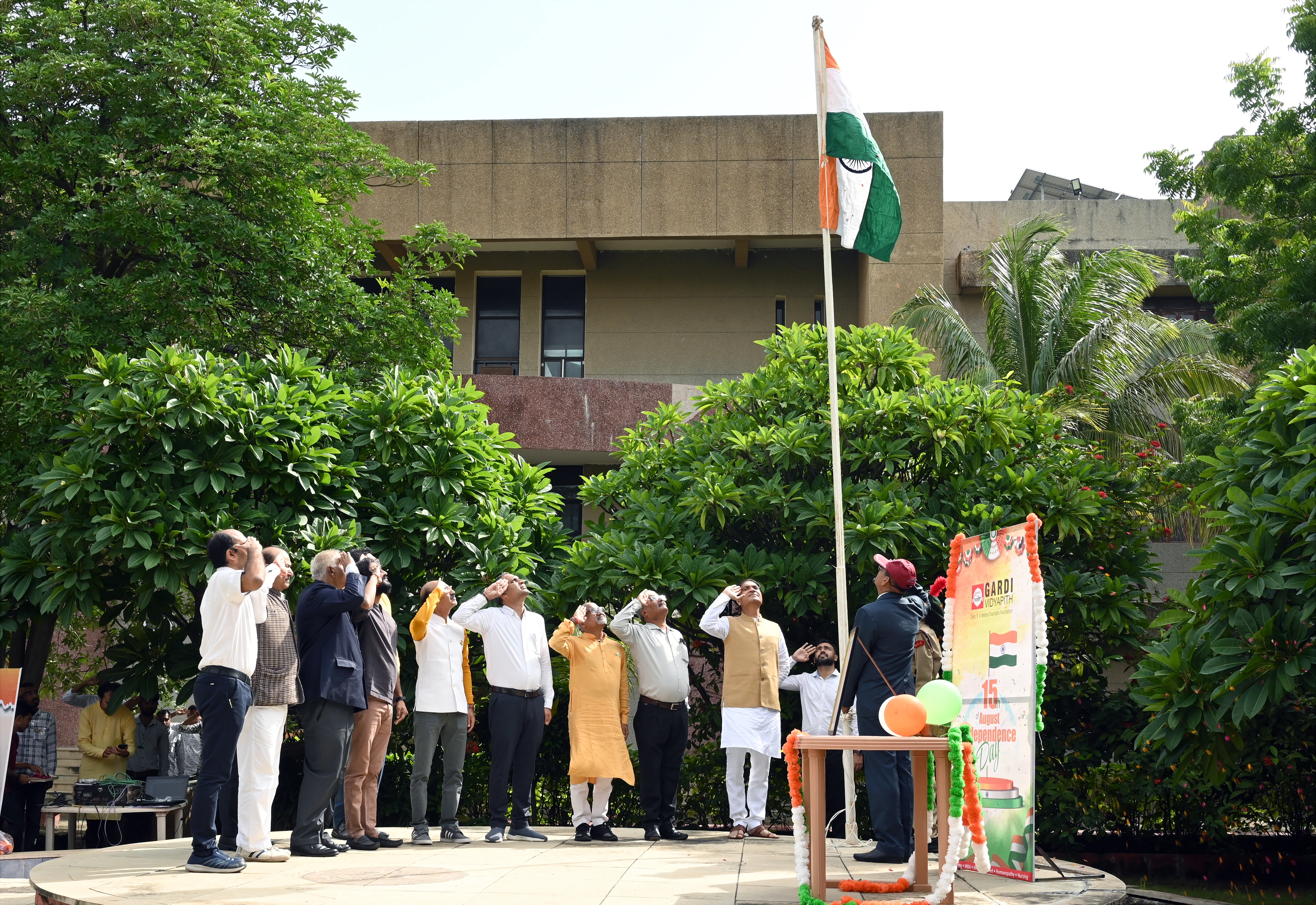On 15th August 2025, B.H. Gardi College proudly celebrated the 79th Independence Day of India with great enthusiasm and patriotism. The celebration commenced at 9:30 AM with the flag hoisting ceremony by the Chief Guest, Dr. J. M. Badiyani, followed by the singing of the National Anthem, which filled the campus with a spirit of unity and pride.