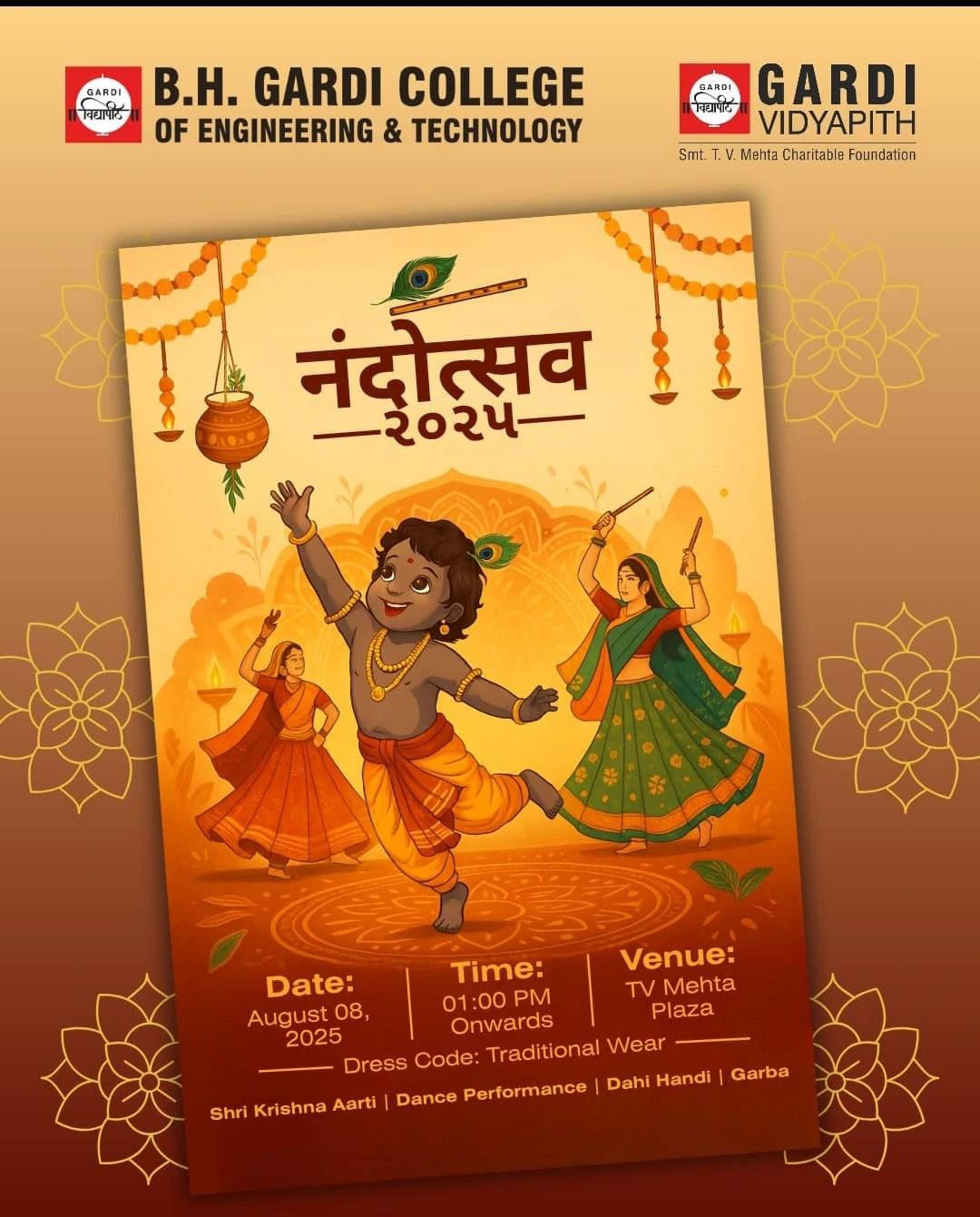 Nandotsav 2025 at B.H. Gardi College of Engineering & Technology (Gardi Vidyapith) was celebrated with devotion and enthusiasm. The program began with a soulful Shri Krishna Aarti, followed by vibrant dance and Garba performances showcasing Gujarat’s cultural spirit. The highlight of the celebration was the thrilling Dahi Handi, where students came together with energy and teamwork, making the event a perfect blend of spirituality, tradition, and joy.